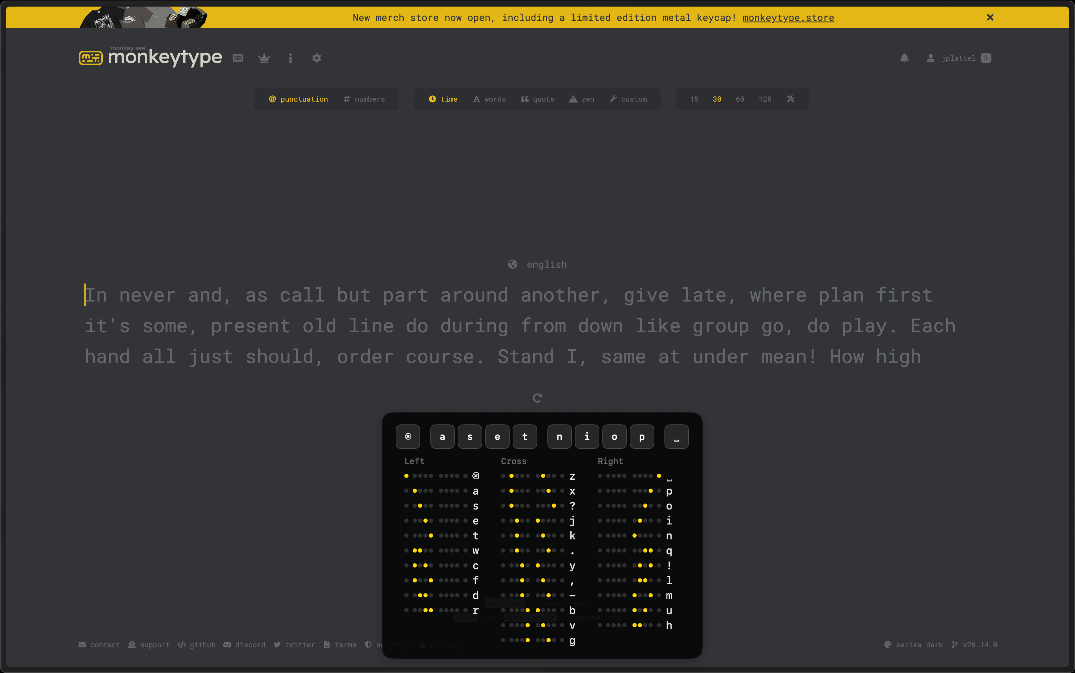 This allowed me to create a very functional overview with hints on which letters are possible. Here’s a screenshot of what it looks like on Monkeytype: